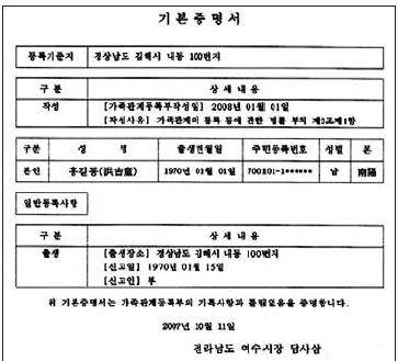 홍길동씨의 기본증명에는 출생연월일·출생지·주민번호·성별·본이 나온다.