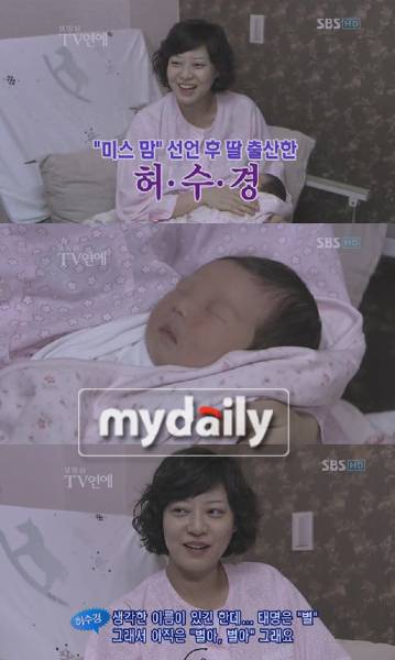 허수경은 이날 방송에서 "태명을 '별이'라고 지었는데 아직까지 이름을 짓지 못해 별이라고 부르고 있다"며 딸을 품에 안은 채 행복한 미소를 감추지 못했다.