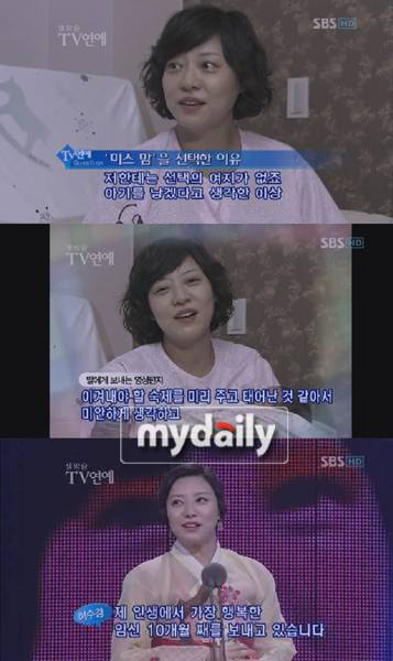 지난해 12월28일 진행된 SBS '연예대상'에서 만삭의 몸으로 라디오 스타상을 수상한 허수경은 무대에 오른 뒤 수상 소감으로 "요즘 제 인생에서 가장 행복한 임신 10개월째를 보내고 있다"고 말해 주위를 감동으로 물들였다.