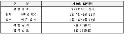 [데일리안 안경숙 객원기자]사단법인 한국평생교육평가원(교평, www,kpe.or.kr)이 주관하는 제20회 국가공인 KP검정시험의 원서접수를 7일부터 18일 까지 받는다. 원서접수는 교평 홈페이지(www.kpe.or.kr)와 전국 KP검정 시도지부를 통해 할 수 있다.