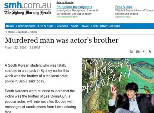 호주의 더 시드니 모닝 헤럴드는 22일(현지시간) 한국 경찰이 시드니에서 흉기에 살해당한 한국인 청년의 형이 한국의 톱스타 배우임을 밝혔다고 보도했다.