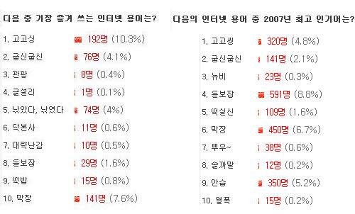 이 조사에서 2위를 차지한 '킹왕짱' 역시 최근까지 인터넷을 장악하고 있는 최고 인기의 인터넷 용어다. '매우 대단하다'는 뜻이다.