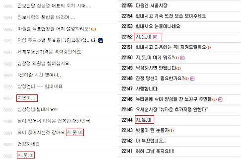 두 후보와 진보신당의 홈페이지에는 네티즌들의 '지못미' 댓글이 줄을 이었다. '지못미'는 '지켜주지 못해서 미안해'를 줄여 만든 인터넷 용어다.