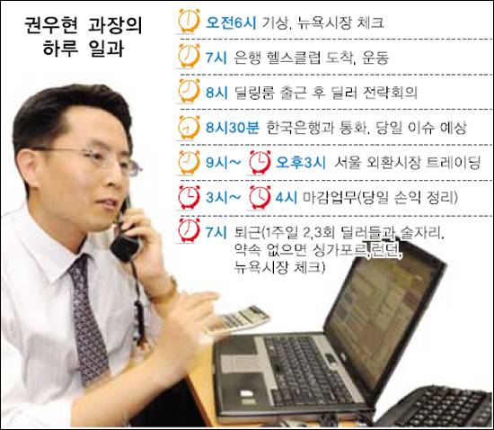 올해로 만4년째 외환딜러 생활을 하고 있는 권 과장은 외환딜러들과 외환당국이 투표로 뽑은 '올해의 최우수 딜러'다. 수익률뿐 아니라, 경쟁자와 감독자에게도 인정받은 인성과 내공의 소유자란 얘기. 그가 전하는 외환딜러들의 세계로 들어가 보자.