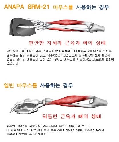 예, 손목과 근육이 뒤틀릴 수 밖에 없는 구조로 만들어진 기존 마우스와는 달리 이 제품은 손목에 맞는 적당한 각도로 마우스를 쓸 수 있게 해주고 있습니다. 그래서 안아파 마우스인거죠.