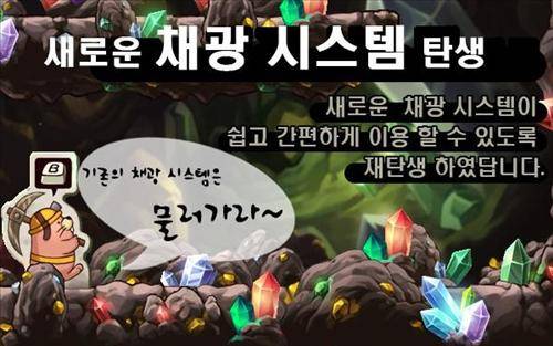 또한, 채광 시스템도 업데이트 되었다. 채광 전용 맵(엘가일, 프란시스 마을에 위치)이 등장하며, B(채광 단축키)를 누르면 자동으로 채광을 한다. 채광으로 습득한 아이템 역시 자동으로 가방(인벤)으로 들어가게 되며, 채광 시 곡괭이(상점에서 판매)가 하나씩 소비되어 특정 시간 동안 곡괭이 소비 없이 사용할 수 있는 황금 곡괭이(캐쉬 아이템)가 추가 된다. 그리고, 채광 시 광물 이외에 원더코인(미니 게임용)과 일정 확률로 원더스톤을 획득할 수 있으며, 원더스톤을 사용하면 랜덤하게 광물이 아닌 다른 아이템으로 교환 받으실 수 있다.