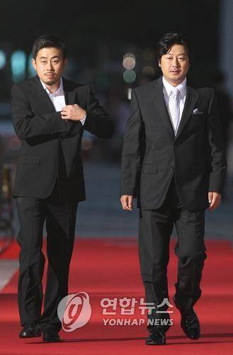 (서울=연합뉴스) 홍기원 기자 = 27일 오후 삼성동 코엑스에서 열린 제45회 대종상 영화제에 참석한 나홍진 감독(왼쪽)과 배우 김윤석이 레드카펫을 밟고 있다.