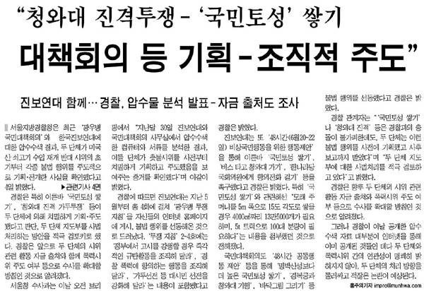 경찰의 수사 결과를 더 정색을 하며 대서특필한 언론도 있다. 문화일보는 4일자 1면에 <&ldquo;청와대 진격투쟁-'국민토성' 쌓기 대책회의 등 기획-조직적 주도">라는 기사를 머리기사로 내보냈다.