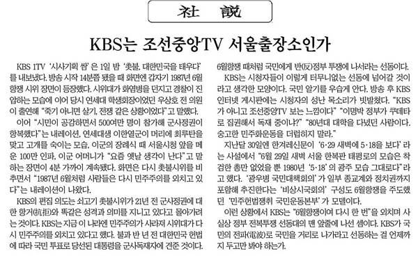 조선일보는 4일자 사설에 <kbs 조선중앙TV 서울 출장소인가>라는 사설을 내보냈다. KBS <시사기획 쌈>이 지난 1일 촛불집회 관련 방송을 내보낸 사실을 지적하며 북한의 조선중앙TV와 비교한 것이다.