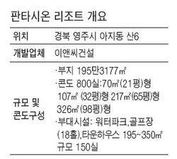 경북 영주시 아지동 산6 일대에 지어지는 이 리조트 단지는 총 부지면적 195만3177㎡(59만830평) 규모에 리조트 76만8832㎡(23만2570평),골프장 118만4345㎡(35만8264평)로 구분된다. 리조트에는 이 외에도 최대 2500여명까지 수용 가능한 대규모 컨벤션 센터가 건설된다. 이달 19일 워터파크 개장을 시작으로 2008년 12월 콘도미니엄의 오픈,2009년 10월 골프장 시범라운딩을 목표로 공사가 진행 중이다.