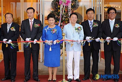 24일 오후 대명그룹 박춘희 회장과 사장단, 김완주 전북도지사,김춘진 국회의원 및 지역 기관장들이 전북 변산 '대명리조트 변산' 개관식에서 테이프 커팅을 하고 있다.