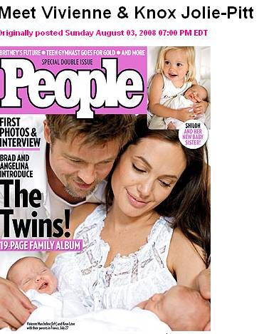 3일 미국의 연예주간지 '피플(People)' 인터넷판은 졸리-피트 커플과 이들 사이에서 지난 7월 초 탄생한 쌍둥이 녹스 레온과 비비안 마셸린의 사진을 독점 공개했다.