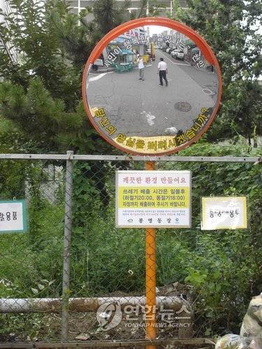 (천안=연합뉴스) 이우명 기자 = 충남 천안시 봉명동 주민센터가 쓰레기 불법투기 발생 우려가 큰 14곳에 이른바 `양심 거울'을 설치해 그 효과에 관심이 쏠리고 있다.