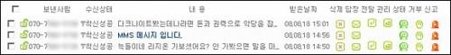 [리스트로 보기]는 목록별로 보여준다. 많은 양의 메시지를 관리할 때 편하지만 MMS는 보여주지 못한다. 그 옆의 [SMS]/[MMS] 버튼은 각각 SMS와 MMS 메시지를 골라 보여준다.