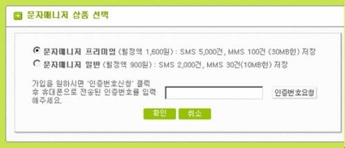문자매니저 요금제에는 프리미엄과 일반이 있다. 가격은 1,600원과 900원인데 각각 SMS 5,000건/MMS 100건(30MB), SMS 2,000건/MMS 30건(10MB)까지 보관된다. 일단 저렴한 일반을 선택하고 인증번호 확인을 한다.