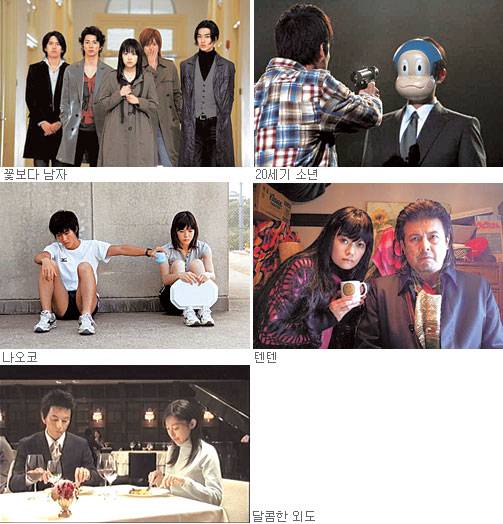 일본 영화 팬이라면 무척 들뜬 기분이 될 것 같다. 오다기리 조, 마츠모토 준, 우에노 주리 등 한국에도 잘 알려진 일본의 유명 배우들이 출연하는 영화 다섯 편이 잇따라 관객들을 찾아오기 때문이다. 11일 개봉하는 '꽃보다 남자' '20세기 소년' '텐텐'에 이어 18일 개봉하는 '나오코' '달콤한 외도'까지 장르도 다양하다.