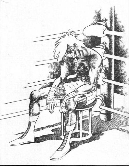 야부키 죠와 링에서 겨루기 위해 살인적인 체중감량으로 자신의 체급을 벤텀급까지 끌어내린 리키이시는 야부키 죠와의 경기 후 사망한다. 소년원 친구였던 리키이시의 사망에 폐인이 된 야부키 죠.