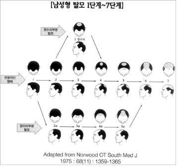 탈모란 머리카락이 가늘어지고 밀도가 떨어지는 현상이다. 탈모가 나타나는 시기와 범위는 개인마다 다르나 대개 20대 중반에서 30대에 시작되며 미국의 노루우드 박사의 탈모 단계에 따르면 1∼7단계로 나뉜다. 각 단계별 증상 및 대처법을 닥터 모모의 이신제 박사 도움말로 알아본다.