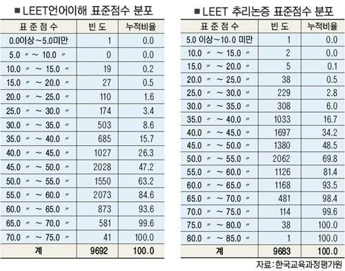29일 한국교육과정평가원이 지난달 24일 9693명이 치른 법학적성시험 성적을 분석한 결과, 언어영역은 응시생들의 표준점수가 0점 이상∼75점 미만, 2교시 추리논증은 5점 이상∼85점 미만 구간에 분포해 추리논증의 표준점수 최고점이 언어영역보다 높게 나타났다.