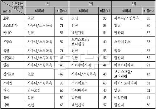 그렇다면 외국의 경우 국가별로 선호하는 미용테라피가 따로 있을까. 통계에 따르면 미국의 경우 전신마사지를, 유럽 국가들은 사우나 및 스팀목욕을 선호하고 호주, 캐나다, 싱가폴 등은 얼굴마사지를 선호하는 것으로 나타났다.