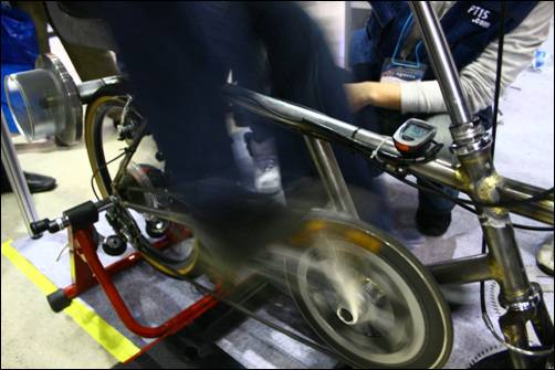 바이크쇼는 기존 회사들이 내놓은 신상품을 보는 자리기도 하지만, 신상품 경연장이기도 하다. '밟을수록 안 나가는 자전거'는 제목 자체가 재밌다. 시스시스템이 만든 이 자전거는 헬스장 렉프레스 방식에서 아이디어를 빌렸다. 사람들은 헬스장에서 자기 몸무게 3-5배 렉프레스를 들어올린다.