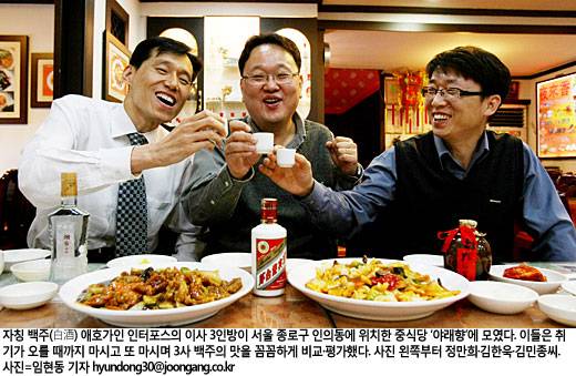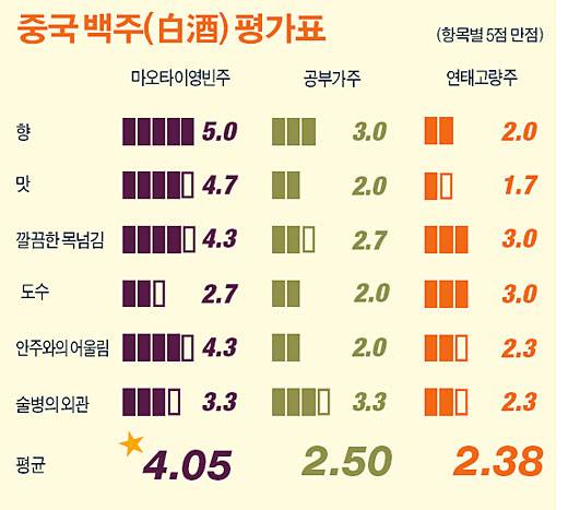 일간스포츠(IS)는 한국에서 가장 많이 알려져있는 중저가 중국 백주인 마오타이영빈주·공부가주·연태고량주를 비교·평가했다. 평가에는 온라인 토탈 마케팅 전문회사 '인터포스'의 이사 3인, 정만희(40)·김한욱(40)·김민종(40)씨가 나섰다. 비교항목은 깔끔하고 부드러운 목넘김·향·도수 등 6가지 항목으로 나눠 평가했다.