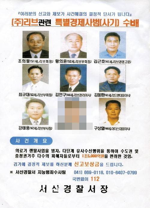 마침내 폭탄 돌리기의 끝은 지난 9월 서울 경인 지방과 충청도를 포괄하는 경인지사(리브)에서부터 터지기 시작했다. 그때까지는 조희팔 일당이 지역별로 회사 이름을 바꿔가며 운영했기 때문에 불법행위를 단속해야 할 검찰과 경찰에서도 이들이 전국 단위의 금융 피라미드 조직을 교묘히 운영한다는 사실을 포착하지 못했다. 그러다 충남 서산경찰서에 경인지부 일부 피해자들의 진정서가 접수되었다. 서산에서 수사가 시작되자 조희팔 회장, 최규대 부회장, 김근호 고문, 강태용 기획담당 이사 등 사기 범죄 주요 책임자들은 대구 본사에 있는 전국 전산망을 파기했다. 이어 투자자로부터 끌어모은 금융 계좌를 인출한 뒤 모조리 도피했다.