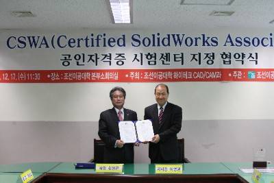 3D CAD 기술 공급 기업인 솔리드웍스(지사장: 이영권 www.solidworks.co.kr)는 17일 조선이공대학에 CSWA(Certified SolidWorks Associates) 인증 지정 시험 센터를 열고, 조선이공대학 김형곤 학장, 최영일 산학협력처장 등이 참석한 가운데 인증 협약식을 진행했다.