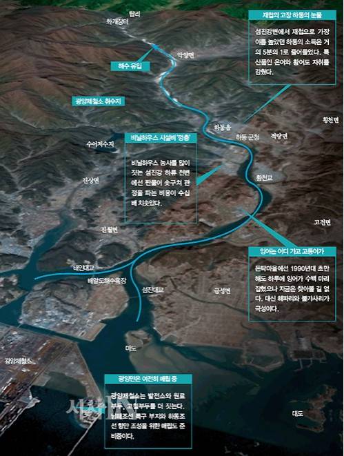 그는 엊그제 숭어 100kg을 잡아 남해 어판장에 갔다가 겨우 9만2000원을 받았다. 기름값도 못 건졌다며 앞으로 숭어를 잡으면 바다에 던져버릴 생각이라고 했다. 물론 기수역 개펄에서 자라던 김·굴·우럭조개·바지락·낙지·백합조개 등도 씨알이 말랐다. 더러운 물을 좋아하는 모시조개만이 판친다. 봄·여름에 농사를 짓고, 겨울에는 김을 기르고, 짬짬이 물고기를 잡아 이곳에서는 한때 '강아지도 1만원짜리를 물고 다녔으나' 이제는 다 지난 일이다. 제철소가 생겨 나라는 잘살게 됐는지 알 수 없으나 이곳 어민은 불행해졌다.