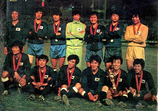 1975년 박대통령배(박스컵)에서 우승한 후 한국대표팀(아랫줄 왼쪽 두번째가 이영무)