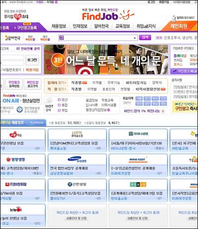 8만여건 채용공고 '취업정보의 저수지'파인드잡(www.findjob.co.kr)은 1996년 생활정보신문 벼룩시장의 인터넷사이트 구인구직 서비스로 시작해, 그동안 축적한 취업정보 제공의 노하우로 2007년 5월 '파인드잡'으로 독립한 온라인 취업포털 사이트다.