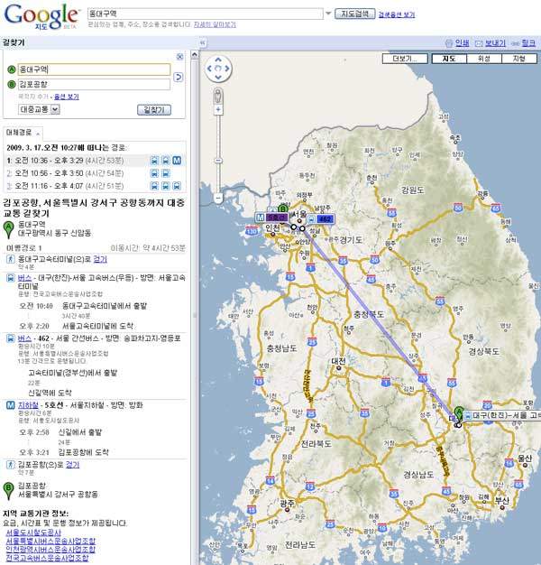 구글에서 '전국 단위' 대중교통 안내 서비스를 시작한다.구글은 무료 지도서비스 '구글 맵스(http://maps.google.co.kr)'에서 수도권과 전국 6대 광역시의 모든 시내버스와 지하철, 고속버스 교통정보를 제공하는 '대중교통 길찾기' 서비스를 시작한다고 17일 밝혔다.