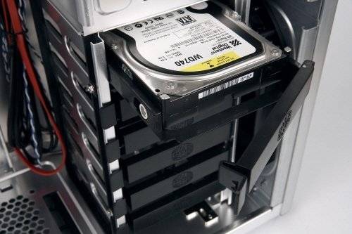 하드디스크 베이는 탈부착이 쉬운 가이드 방식이다. 진동에 의한 소음과 하드디스크의 파손을 막는 고무 베어링을 중간에 넣었다. |