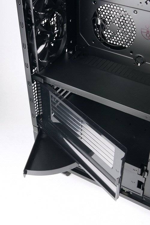 위에 달린 230mm 팬 2개를 떼어버리면 수랭식 쿨러를 끼울 수 있다. 파워서플라이는 최대 2개까지 달아도 공간이 여유 있다. 드라이브 베이는 나사가 필요 없는 툴 프리 방식이고, 하드디스크의 진동을 없애는 베어링을 달았다.
