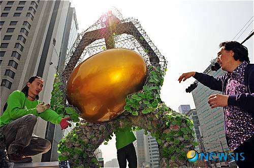 서울시 도시갤러리 프로젝트 2009의 일환으로 6일 서울광장에서 환경조각가인 김석 서울시립대 교수의 지휘 아래 높이 4m 초인상인 철골 조형물 '서울시와 함께 일어서自!' 작업이 진행되고 있다.