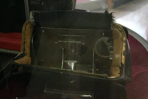 러시아 페드(Fed)가 1935년에 만든 소형 레인지파인더 카메라를 구소련 KGB가 여성용 핸드백에 달아 사용했다. 가방 측면을 누르면 필름이 감기고 액세서리가 달린 부분을 들고 우측 부분을 누르면 사진을 찍을 수 있다. 현재 남아있는 것이 몇 개 없다고 한다. |