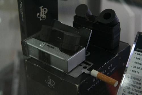 우크라이나 키에프 아스날(Kiev Arsenal)이 1981년 생산한 담뱃갑 카메라. 금속으로 검게 만든 담뱃갑 속에 키에프 베가(Vega) 카메라를 넣었다. 담배 필터 중 제일 긴 것을 당기면 셔터가 장전된다. |