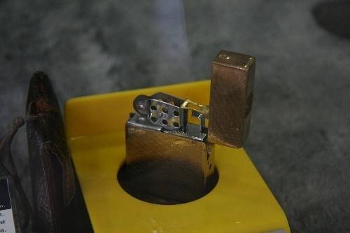 지포라이터 모양 카메라는 일본 도쿄 스즈키옵티컬(Suzuki Optical)이 1956년에 생산했다. 금장인 몸체 왼쪽은 라이터 기능을 하고 나머지 부분에 카메라 관련 부품이 들어 있다. 영화 '로마의 휴일'에서 여주인공을 찍던 카메라와 같은 모델. |