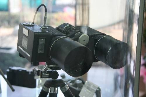일본 리코(Richo)가 1970년에 생산한 쌍안경 카메라 텔레카240은 7×50 배율의 쌍안경 왼쪽 렌즈에 스프링 모터를 단 카메라 기능을 넣어 18×24mm 크기 사진을 찍는다. |