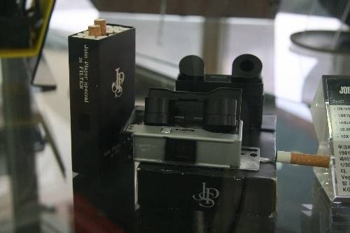 우크라이나 키에프 아스날(Kiev Arsenal)이 1981년 생산한 담뱃갑 카메라. 금속으로 검게 만든 담뱃갑 속에 키에프 베가(Vega) 카메라를 넣었다. 담배 필터 중 제일 긴 것을 당기면 셔터가 장전된다. |