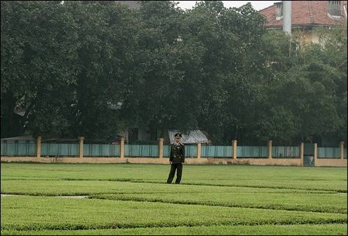 그러나 문제는 막상 무덤가에 도착하고 나서 벌어졌다. 시간이 얼마 남지 않은 듯 한데 호치민 무덤으로 들어가는 줄의 끝이 보이지 않는 것이었다. 바쁜 마음에 무덤 앞 잔디밭을 가로지르려 하니 옆에 서 있던 군인이 뭐라 소리를 지르며 제지했다. 그러고 보니 무덤가 곳곳에는 군인들이 깔려 있었다.