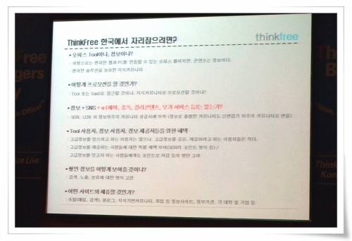 지난 3월 31일 오후 7시부터 삼성동 코엑스에서 씽크프리 오피스 라이브 한국 출시 간담회가 열렸습니다. 한글과컴퓨터 하위 조직으로 씽크프리는 라이선스 기반 소프트웨어를 판매하는 것이 아니라 SaaS 형태의 서비스형 오피스(워드, 스프레드시트, 프레젠테이션)를 개발·판매하는 것이 목적인 조직입니다.