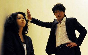 김옥빈(왼쪽), 송강호."(옥상에서 떨어지는 장면을 위해) 거꾸로 매달렸어요. 와이어에 발목이 묶인 채 공중으로 끌려 올라가는데…. 아무런 정신이 없어요. 연기를 하긴 해야겠고…. 엔지가 났는데 내려주지도 않아요. 계속 매달려 있었죠."(김옥빈)