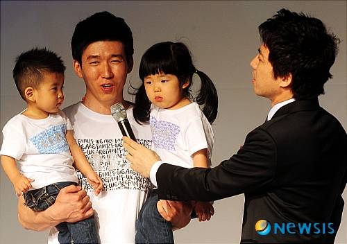 14일 오후 서울 웨스틴 조선호텔 그랜드볼룸에서 '코튼 데이 2009'가 열린 가운데 패밀리룩 패션쇼에서 가수 션이 아이들과 의상을 선보이고 있다. /서재훈기자 jhseo@newsis.com