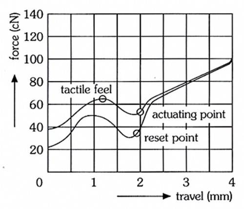 위 그림은 특히 체리 MX Keyclick의 키 특성을 표시하고 있는데, 압력에 따라 슬라이더가 움직이는 깊이(키 스트로크)와 손을 뗄 때 생기는 반발력과 깊이 변화를 그래프로 그린 것이다. 여기서 Operating Position(Actuating Point : 입력 지점)은 키를 누를 때 입력이 일어나는 깊이를, Release Position(reset Point : 해제 지점)은 키를 뗄 때 입력이 해제되는 깊이를 의미한다. 입력 바로 직전에 키 압력이 갑자기 높아지는 지점은 촉각 감지 지점(Tactile Feel Postion) 이라고 부른다.