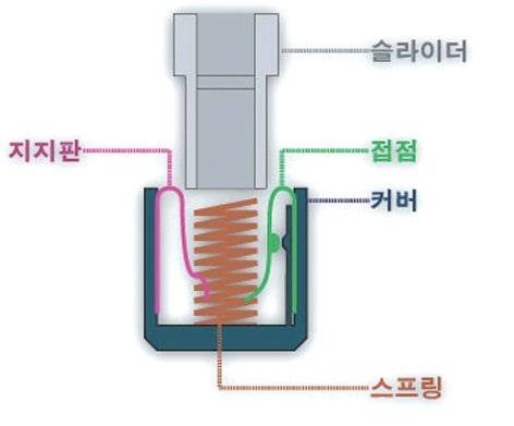 기계식 키 스위치의 구조일반적인 기계식 키 스위치는 커버, 슬라이더, 스프링, 지지판, 접점으로 이뤄져 있다. 슬라이더가 아래쪽으로 움직이면 스프링에 의해 압력(반발력)이 걸리고, 지지판이 휘어지면서 슬라이더를 움직이는데 필요한 압력이 미묘하게 달라진다. 마지막으로 접점이 부딪히며 키 입력을 감지한다. 상세한 구조는 메이커마다 다르지만 기본적인 원리는 거의 비슷하다.