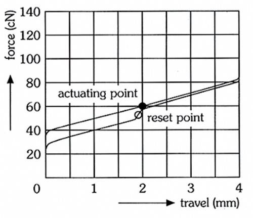 위 그림은 특히 체리 MX Keyclick의 키 특성을 표시하고 있는데, 압력에 따라 슬라이더가 움직이는 깊이(키 스트로크)와 손을 뗄 때 생기는 반발력과 깊이 변화를 그래프로 그린 것이다. 여기서 Operating Position(Actuating Point : 입력 지점)은 키를 누를 때 입력이 일어나는 깊이를, Release Position(reset Point : 해제 지점)은 키를 뗄 때 입력이 해제되는 깊이를 의미한다. 입력 바로 직전에 키 압력이 갑자기 높아지는 지점은 촉각 감지 지점(Tactile Feel Postion) 이라고 부른다.