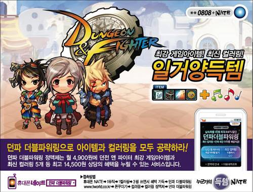 인기 온라인 액션게임 '던전앤파이터'(이하 던파)를 활용한 컬러링서비스 '던파 더블파워링'이 출시되었다.'던파 더블파워링'은 게임업계 최초로 최신 컬러링과 인기 온라인게임이 결합한 SK텔레콤 월정액 서비스로서, 5월 18일부터 던파 공식홈페이지(df.nexon.com)와 Tworld(www.tworld.co.kr)를 통해 가입할 수 있다.