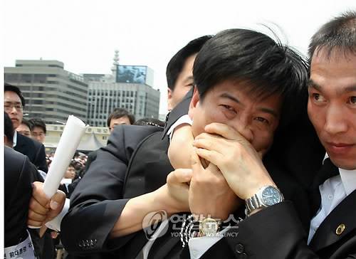 (서울=연합뉴스) 조보희 기자 = 29일 경복궁 앞뜰에서 열린 故 노무현 전 대통령 영결식에서 이명박 대통령이 헌화.분향을 하자 백원우 민주당 의원이 뛰어나오며 고함을 지르다 경호원들에게 제지당하고 있다. 2009.5.29