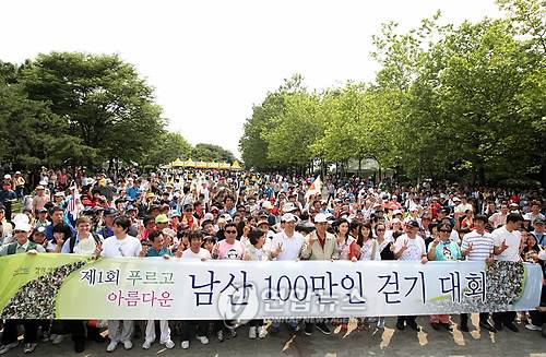 (서울=연합뉴스) 이지은 기자 = 오세훈 서울시장, 나경원 한나라당 의원, 황영조 홍보대사 등 내빈들과 시민들이 13일 오후 서울 남산 백범광장에서 열린 '제1회 남산 100만인 걷기 대회'에서 산책로를 향해 힘찬 출발을 하고 있다. 서울시는 누구나 무료로 참여해 남산공원 산책로를 함께 걷는 이 대회를 이날부터 연말까지 매달 두 차례씩 연다고 밝혔다.2009.6.13